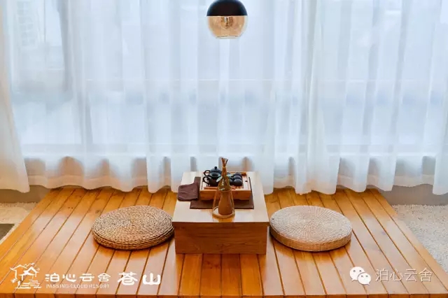 而在房间里,配有整套茶具以及打坐和冥想用的蒲团。一花一叶,一瓶一枝,都诉说着东方禅意的悠远与宁静。