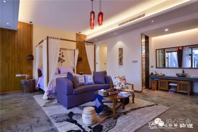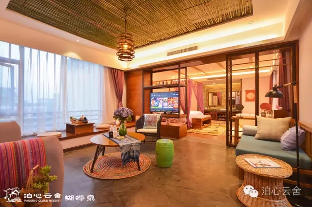 如鹤庆房,因鹤庆银器出名,故房内会有特色银饰作为装饰;剑川房,剑川木雕特色在房内有迹可循;喜洲,电影“五朵金花”的故乡,通过大面积颜色对比,将喜洲扎染融入喜洲房中;蝴蝶泉,以浪漫的粉色为基调,纱幔飘动处,一只蝴蝶轻舞飞扬,整个房间都灵动起来。